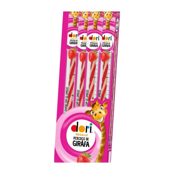 Sabor clássico com um visual divertido! O Display Dori Regaliz Pescoço de Girafa Morango traz 30 unidades de 30g de regaliz macio, colorido e alongado, com o delicioso sabor de morango que agrada todas as idades. Com seu formato criativo que lembra o pescoço de uma girafa, é perfeito para atrair a atenção no ponto de venda.